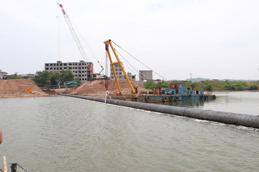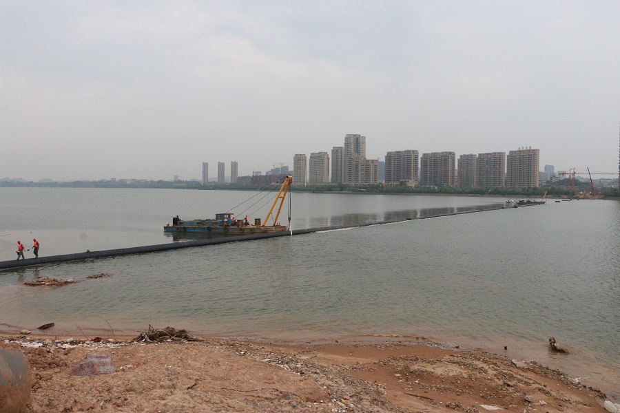 589米的跨江沉管橫跨信江江面,猶如一條黝黑的巨龍,蔚為壯觀。吊機(jī)、船舶在有條不紊的作業(yè)。跨信江倒虹吸管工程為旭日水廠、和濟(jì)水廠供水,其供水規(guī)模為7萬(wàn)噸/天,最大日供水為8.19萬(wàn)噸,設(shè)計(jì)最大公稱壓力為1.0MPa,管段內(nèi)徑1.0m??缧沤购缥L(zhǎng)589.0米,全段采用沉管法施工,施工難度較大。