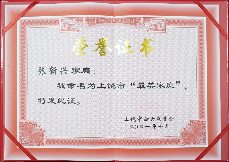 日前,我司員工張新興家庭獲上饒市“最美家庭”榮譽(yù)稱號(hào)。