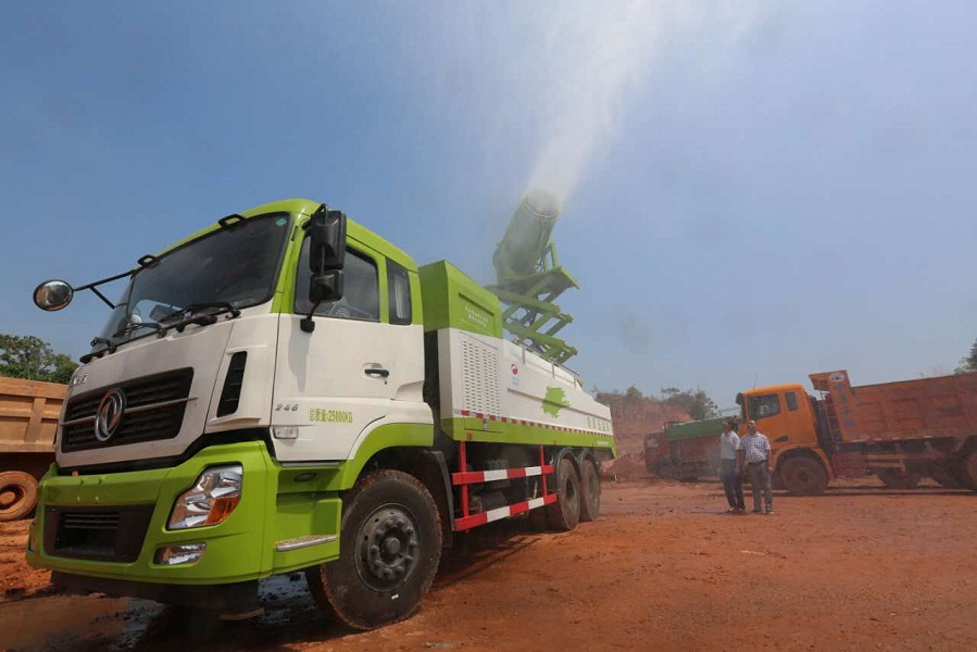 噴霧壓塵車(又稱多功能抑塵車)是一款以噴霧降塵為設(shè)計原理的新型環(huán)境治理產(chǎn)品。降塵原理主要是將水通過加壓加速霧化,使其均勻地與空氣中的粉塵融合,利用水霧分子表面強大的附著力吸附粉塵,最終達到降塵目的。噴霧壓塵車的車載式移動作業(yè)、噴霧平臺自由升降,使其具有很好的機動性能、工作效率、降塵效果。噴霧壓塵車采用高壓水泵和特殊噴嘴將水霧化成直徑約10~200μm的水霧,通過高性能的遠射風(fēng)機將水霧送到粉塵集中處,水霧與粉塵結(jié)合、吸附、成團、變重,在自身的重力作用下沉降到地面,從而達到有效降塵的目的。