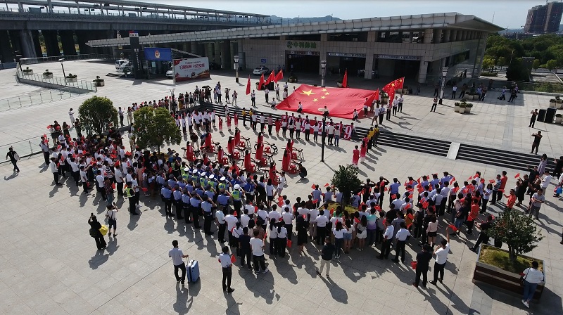 快閃活動在古箏合奏《盛世國樂》中拉開帷幕,悠揚(yáng)的樂聲吸引了樞紐場站乘車的八方旅客,人們紛紛駐足觀看,一曲唱罷,人群中走出一支樂隊(duì),用電吹管合奏起《歌唱祖國》的旋律,現(xiàn)場圍觀人群越聚越多,最后,12位歌手從人群不同方向走來,演唱《我和我的祖國》,現(xiàn)場聚集的400余名群眾受到感染齊聲高唱,一面巨大的五星紅旗出現(xiàn)在場站中間,快閃活動被推向高潮。一時間,濃郁的喜慶氛圍充滿整個廣場,城投人用別樣的方式表達(dá)濃濃的愛國情懷,迎接國慶節(jié)的到來。