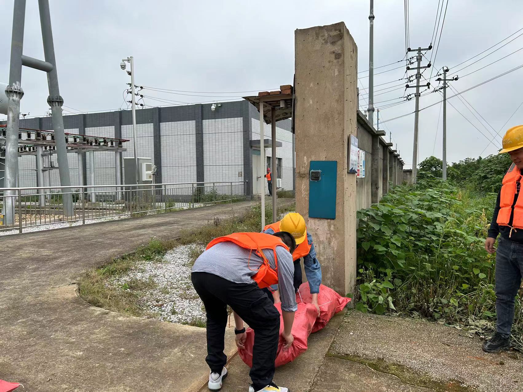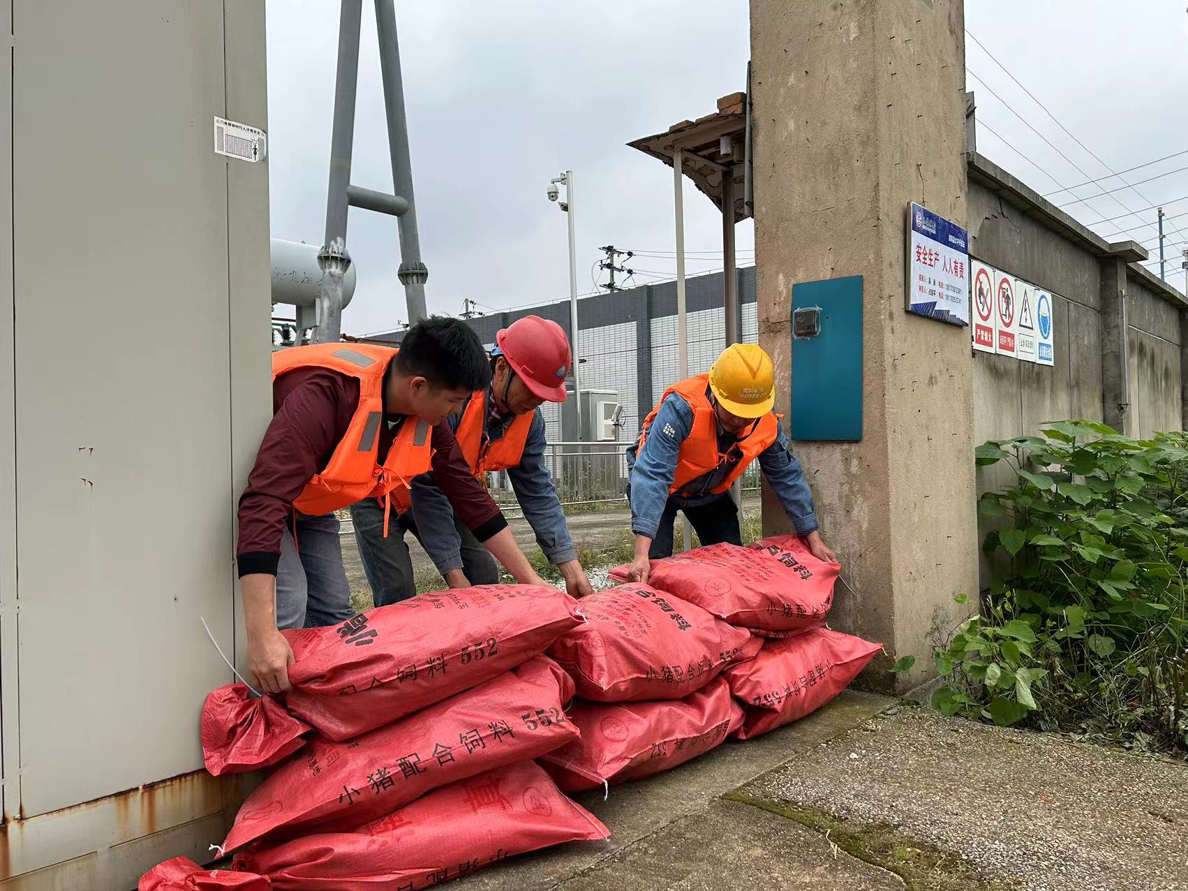 2.二組搶險分隊火速裝運防洪沙袋,并在太平110KV升壓站門口處堆疊防洪沙袋,防止洪水涌入升壓站站內(nèi)。